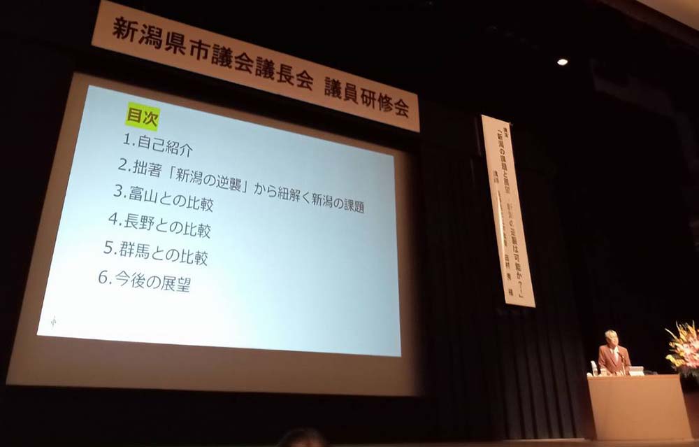11/4㈮ 議員研修会に参加しました。 11月4日㈮ 議員研修会に参加しました。新潟県の市議会議員が、長岡市立劇場に集まりました。 長野県立大学教授の田村秀先生より、「新潟の課題と展望-新潟の逆襲は可能か?-」と題しての講演を聴きました。田村先生は、新潟大学にも17年間勤務され、学部長も務められました。新潟州構想やBRTなどで、時の知事や市長と激しく議論を闘わせた方でもありますので、新潟に対して厳しくも愛ある助言をいただいて来ました。 りゅうたろう 皆様の「声」を市政に! 投稿を作成しました 255
