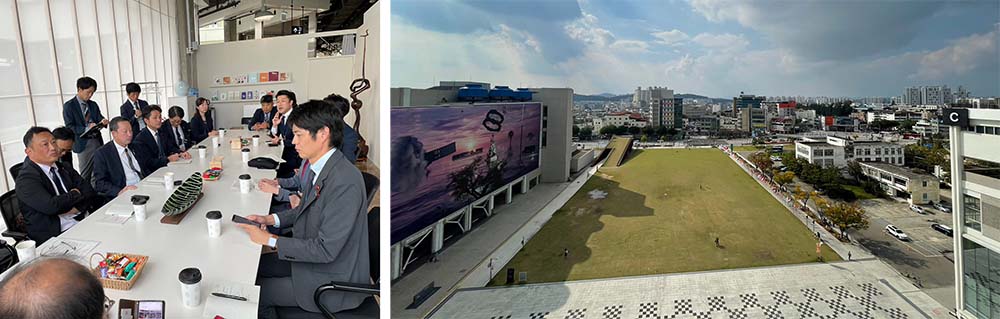 キム議長と皆川議長の間では予定時間を超過するほど熱心なやり取りがありました。広い芝生広場の写真がありますが、この広場でまさに「新潟の文化」と言える新潟総踊りができたら素晴らしいなと思ったりも致しました。