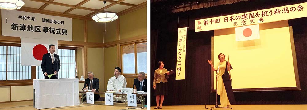「皆でお祝いし、建国の理念と日本の誇りに思いを致す日」地元新津総鎮護堀出神社で開催された新津地区奉祝式典と新潟市民プラザでの日本の建国を祝う新潟の会に、参加致しました。国を愛する心を養うと共に私達の誇りある日本を守ってきた先人の努力に対し感謝と敬意を表し、国の安定発展をお祈りした一日となりました。市民プラザでの第一部においては、郷土新潟の歌姫「葉月みなみ」さんが、持ち前のマジカルボイスで、誇りある日本に生まれた喜びを遠藤実先生作曲の歌に乗せて披露してくれました。記念式典においては花角知事の祝電披露、中原市長よりの祝辞をいただき、聖寿万歳で結びとなり、第三部では戦後ジャ−ナリストの「佐波優子」氏による記念講演「日本に生まれた幸せを寿ぐ」と題したお話しを聴かせていただきました。相変わらずの写真下手ですが、堀出神社で私の祝辞、熱唱の葉月みなみさん、講演する佐波優子さんの写真です。