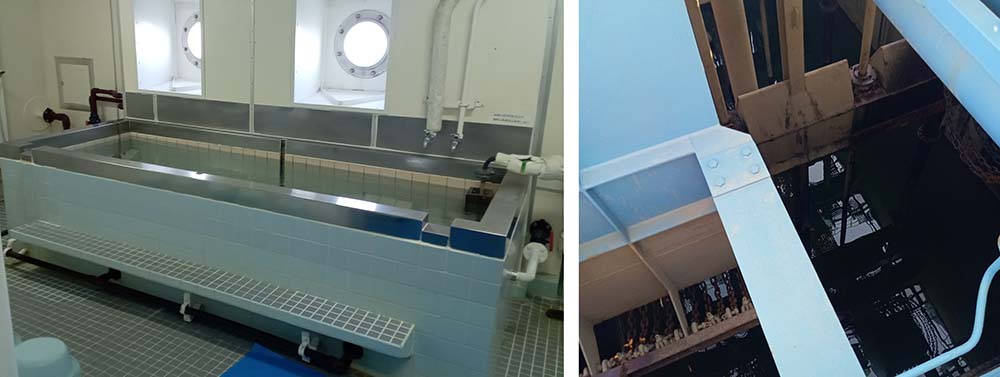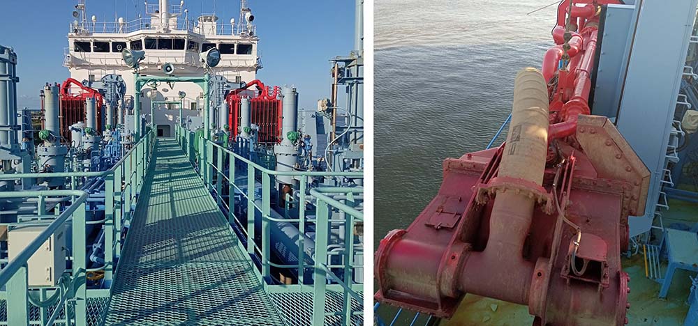 写真は、白山丸の船内(お風呂場や炊事場もあります)浚渫設備などです。操舵室の椅子に座らせてもらい、すっかり船長気分の私です。