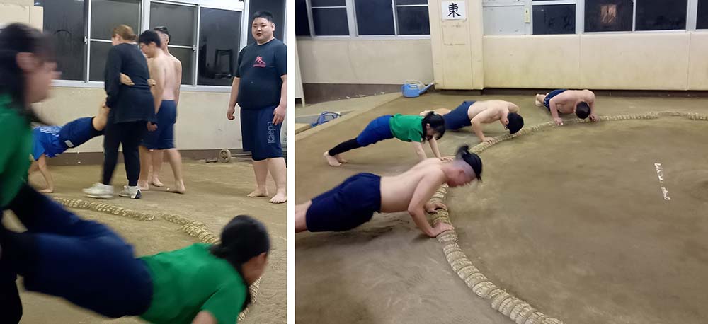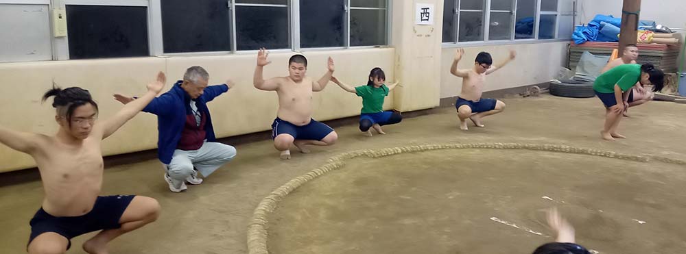 水曜の稽古日にあっては、冬の間は「まわし」を巻かず、相撲は一切とらずに基礎トレーニングに励んでいます。四股100回、踵上げ10回、すり足10分、腕立て10X5、腹・背筋それぞれ20X3、手押し車1周X2等あまり、経験しなかったトレーニングですので、子どもたちはフゥフゥいいながら励んでいます。