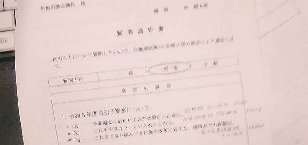 お知らせ, 活動報告 令和3年2月定例会、開会中です。3月5日の最後から2番目に質問させていただきます。 りゅうたろう2021年3月3日2021年3月12日 令和3年2月定例会、開会中です。4日木曜日からは、一般質問が始まります。今回は21人の議員が質問を致します。私の質問内容ですが、令和3年度予算、企業誘致と都市整備、マリンピア日本海について等です。只今原稿の最終調整中です。 傍聴に来ていただけましたらとても有難いです。インターネットで生中継もやってます。今回の質問も分かりやすく爽やかにを心がけて頑張ります。 議会日程 議会ライブ中継 林龍太郎ライブ中継 令和3年2月定例会 本会議 一般質問 りゅうたろう 皆様の「声」を市政に! 投稿を作成しました 247