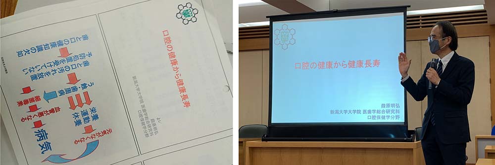 新大大学院医齒学総合研究科口腔保健学分野の葭原明弘教授より、齒・口腔と全身の健康状態などとの関係について、講義をしていただきました。お口の健康が全身の健康状態に大きく影響する事を学びました。定期的な検診を歯医者さんでやってもらうことの大切さを感じました。